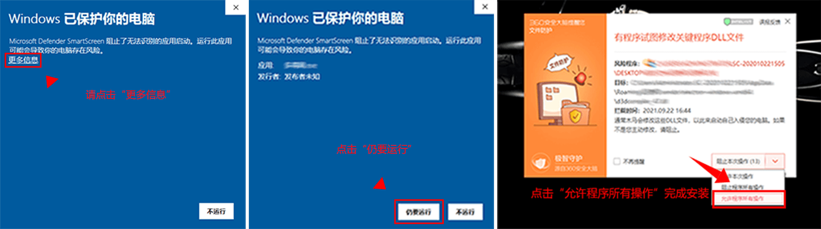 请点击“更多信息” -- “仍要运行”完成安装; 注意:如果装有安全软件,弹出图三的弹框需要“允许程序所有操作”